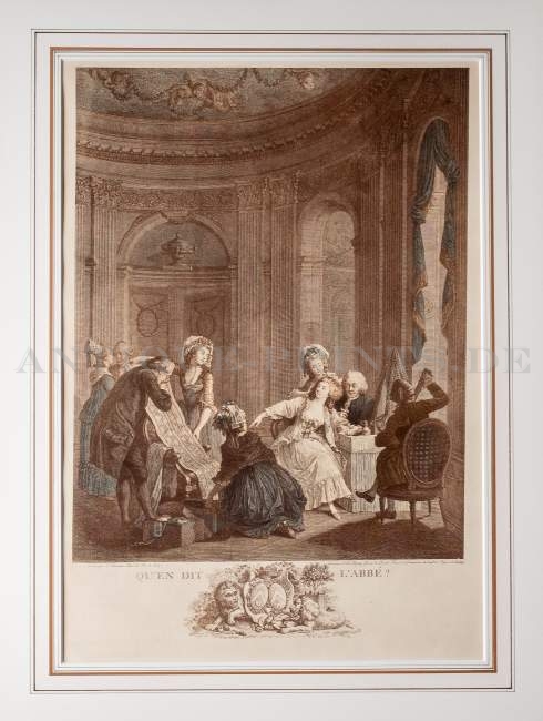 France. Original etching engraved by Nicolas de Launay after Nicolas Lavrince or Lavreince. Later colour issue (beginning of the XIXth century) in sepia from the original from 1778. Very good condition. 38x30cm. Matted. Twin of