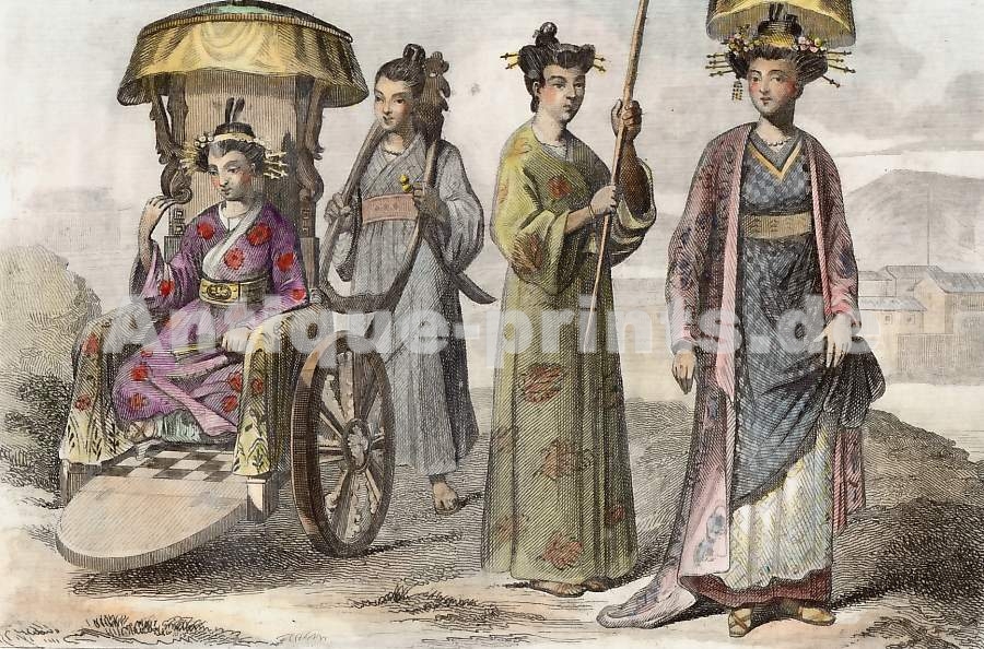 Japan. Stahlstich von Lemaître. 1850. Kleiner Defekt im Himmel. Handkoloriert. 14x9cm. Mit Passepartout.