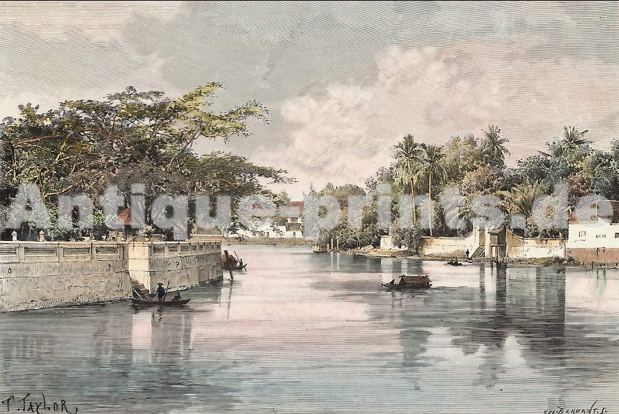 France. Original wood engraving drawn by Lara, engraved by Thorigny. Printed on the reverse side. 1882. Good condition. Hand-coloured. 14,5x10cm. Matted.
