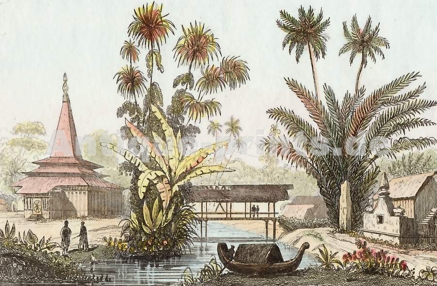 India. Original steel engraving, engraved by G. Hollis after W. Daniell. 1834. No title on the plate. Small foxing spot in the right margin. Hand-coloured. 14,5x9,5cm. Matted.
