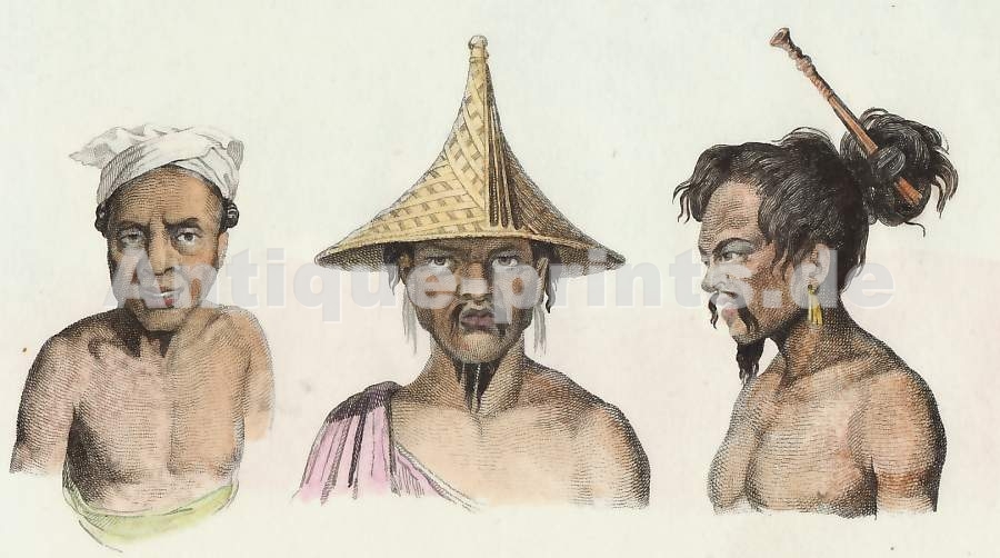 India. Original steel engraving, engraved by E. Grünewald. 1835. Very good condition. Printed on blue paper. Hand-coloured. 16,5x10cm. Matted.