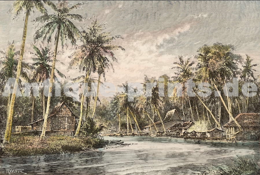 Iles Banda. Gravure sur bois, gravée par A. Kohl d´après T. Weber. 1889. Très bonne condition. Aquarellée à la main. 19x13cm. Montée sous passe-partout.