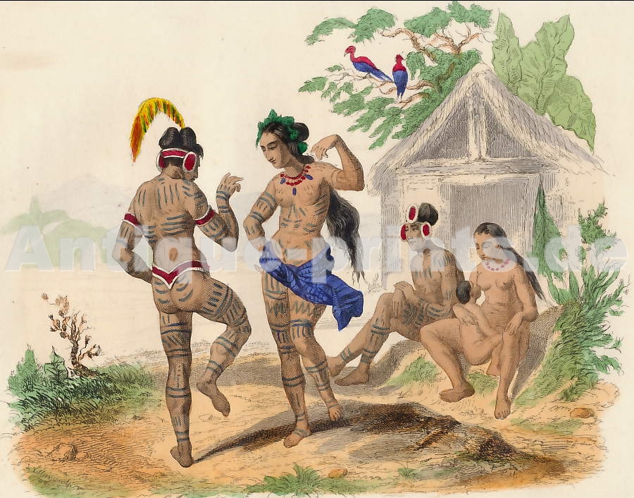 Îles Marquises. Gravure originale sur acier gravée par De Villiers. 1844. Bon état. Aquarellage d´époque. 16,5x13,5cm. Montée sous passe-partout.