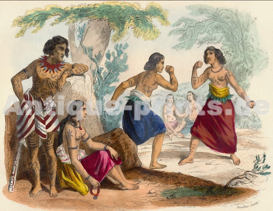 Iles Marquises. Gravure sur acier gravée par Chavannes d´après Danvin. 1837. Très bon état. Aquarellée à la main. 14x9cm. Montée sous passe-partout.