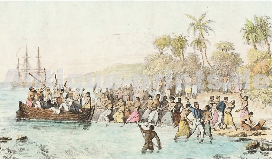 Afrique du Sud. Gravure sur bois, gravée par C. Barbant d´après A. Slom. 1888. Légères rousseurs dans les marges. Aquarellée à la main. 19x13cm. Montée sous passe-partout.
