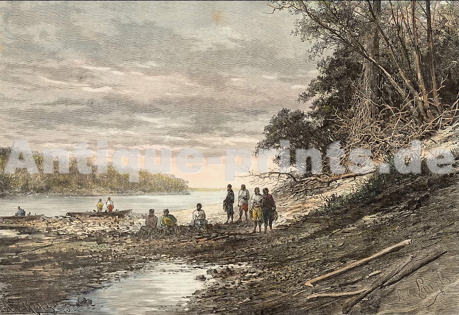 Îles Marshall. Gravure sur bois, gravée par Mercier. 1843. Légères rousseurs. Aquarellage d´époque. 16x8cm. Montée sous passe-partout.