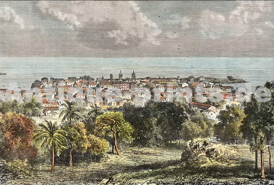 Panama. Original wood engraving drawn by A. Slom, engraved by F. Méaulle. 1878. Good condition. Hand-coloured. 19x13cm. Matted.