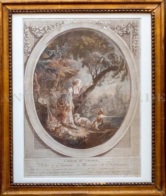 Genre. Original etching with aquatinta printed in coulour, engraved by J. F. Janinet after N. Lavrince or Lavreince. 1788. Good condition, some creasing in the low margin. 35x27,5cm. Framed*: 53x41cm. DHL shipping only.