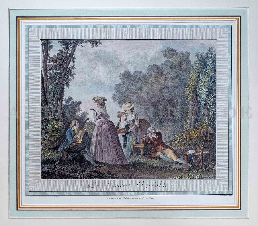 Genre. Radierung von C-N. Varin nach N. Lavrince oder Lavreince. 1784. Sehr guter Zustand. Handkoloriert. 36,5x28,5cm. Gegenstück von