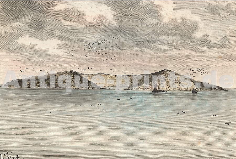 Île Saint-Paul. Gravure sur bois, gravée par Hildibrand d´après Taylor. 1889.Rousseurs dans les marges. Aquarellée à la main. 19x13cm. Montée sous passe-partout.