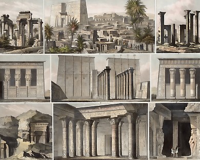 1. Temple of Antaeopolis, 2. Theatre in Antinoe, 3. Ruins of Apollinopolis Magna, 4. Temple of Carnak, 5a. Temple of Tentyra, 5b. Temple at Latopolis, 6. Temple on the Island of Philae, 7. Rock-Cut Tombs of Silsilis, 8. Entrance to the Temple of Thyphon at Denderah.