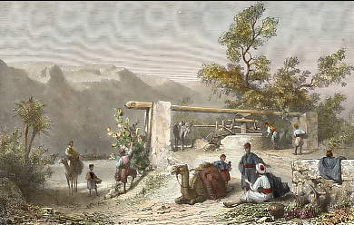 Egypt. Original wood engraving drawn by K. Girardet, engraved by A. Gusmand. 1860. Very good condition. Hand-coloured. 15,5x9,5cm. Mounted.