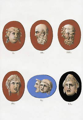 I. Masque de satyre, II. Masque tragique de femme, III. Masque d´un vieillard à visage paisible, IV. Masque comique de femme, V. Masque satyrique, VI. Masque de faune. (Cornaline, Saphir).