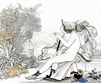 Anakreons Oden. Strichradierung von H. G. Chatillon nach A.-L. Girodet. 1825. Leicht stockfleckig in den Rändern. Handkoloriert. 17x14,5cm. Mit Passepartout.
