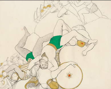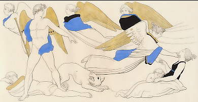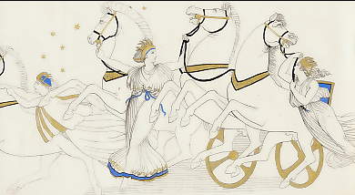 Mythologie. Strichradierung von Feillet und Laqueson nach John Flaxman. 1823. Großer restaurierter Riss im rechten Rand. Handkoloriert. 36,5x17,5cm. Mit Passepartout.