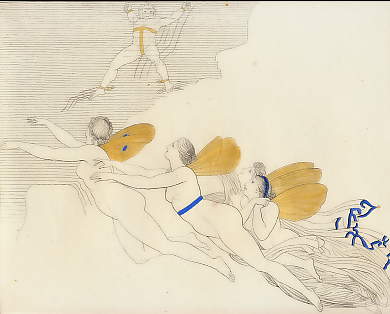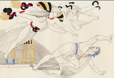 Mythologie. Strichradierung von Feillet und Laqueson nach John Flaxman. 1823. Restaurieter Riss im Rand. Handkoloriert. 34x22,5cm. Mit Passepartout.