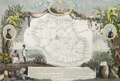 La Reunion. Stahlstichkarte von H. Dandeleux nach Michel. 1835. Leichte Wasserflecken in den Rändern. Handkoloriert. 23,5x19cm. Mit Passepartout.