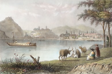 Ungarn. Stahlstich von R. Wallis nach W. H. Bartlett. 1842. Sehr guter Zustand. Handkoloriert. 17,5x11,5cm. Mit Passepartout.