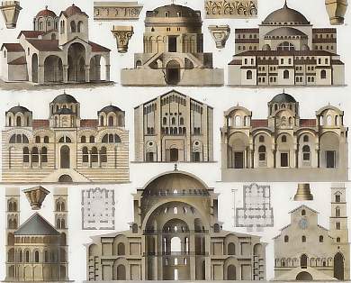 1. Panhagia Nicodimo in Athens, 2. Church of Samara in Greece, 3-4. St. Sophia´s in Constantinople, 5-12. The Church of Theotokus in Constantinople, 13-14. Details of the Panhagia Nicodimo, 15. St. John´s Church in Pavia, 16. Church in Trani, 17. St. Castor´s Church in Coblentz, 18. Mausoleum of Theodoric in Ravenna, 19. Capital from the Turkish Baths in Constantinople.