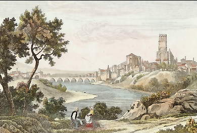 France. Original steel engraving drawn by J. D. Harding, engraved by W. Radclyffe. 1834. Very good condition. Hand-coloured. 14x9,5cm. Matted.