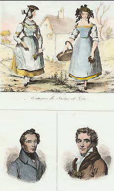 Frankreich. Stahlstich. Costumes de Saône et Loire: gezeichnet und gestochen von Lacauchie. Lamartine, Prud´hon: von Réville nach Couché. 1835. Sehr guter Zustand. Handkoloriert. 19,5x12cm. Mit Passepartout.