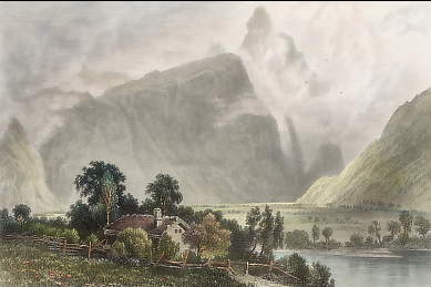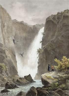 Norwegen. Holzstich von S. Pannemaker nach G. Dorg. ca 1880. Sehr guter Zustand. Auf der Rückseite gedruckt. Handkoloriert. 23,5x19cm. Mit Passepartout.
