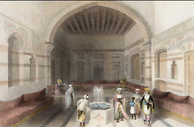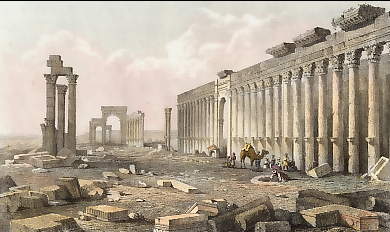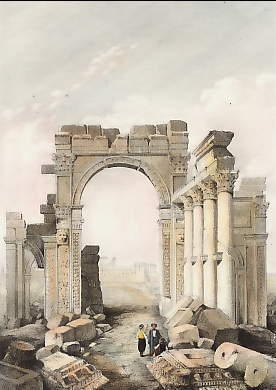 Syria. Original steel engraving drawn by A. W. Calcoott, after a sketch by C. Barry, engraved by E. Finden. Decorative border. ca 1860. Good condition. Hand-coloured. 13,5x10cm. Matted.