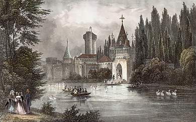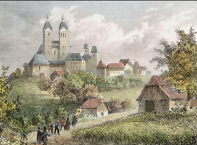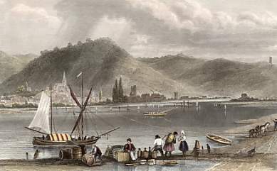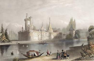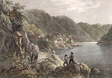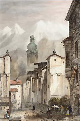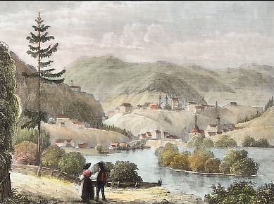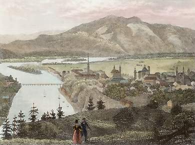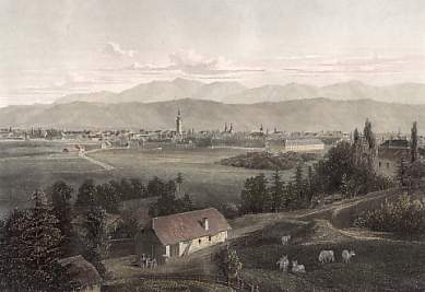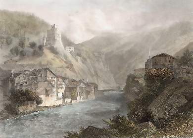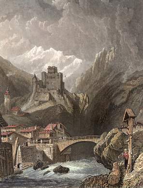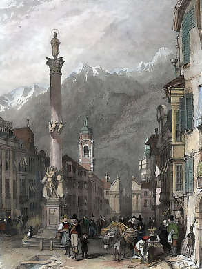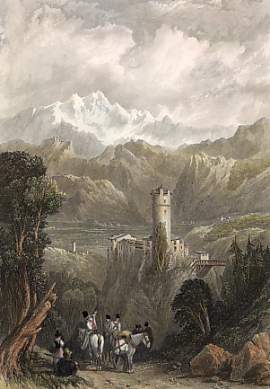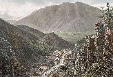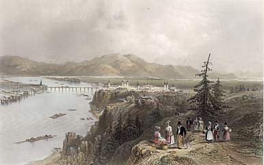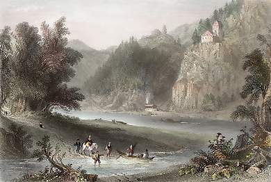 Austria. Original steel engraving, drawn by W. H. Bartlett, engraved by J. Cousen. 1842. Good condition. Hand-coloured. 18,5x11,5cm. Matted.