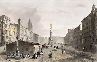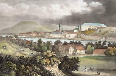 Austria. Original steel engraving, drawn by C. Stanfield, engraved by J. T. Willmore. 1832. Small foxing spots in the margins. Small margins, as issued. Hand-coloured. 13x10cm. Matted.