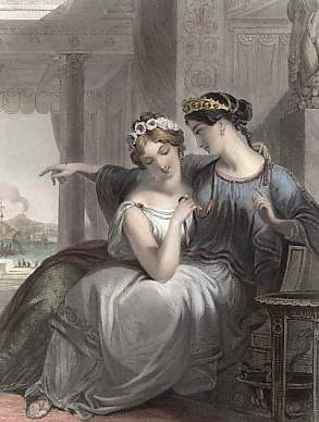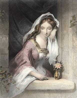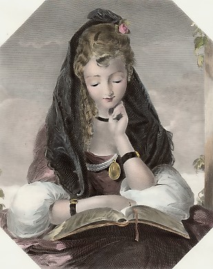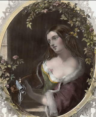 Varia. Stahlstich von E. Finden nach W. Maddox. 1853. Guter Zustand. Handkoloriert. In gestochener Rankenbordüre. 16,5x13,5cm. Mit Passepartout.