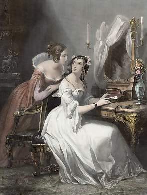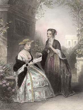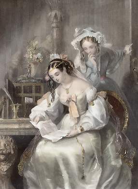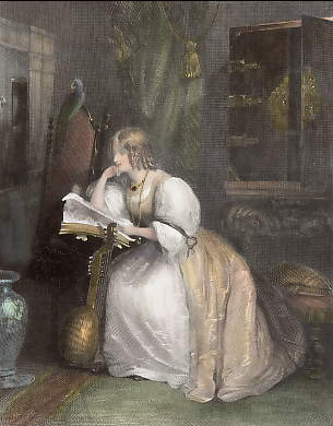 Varia. Stahlstich von T. W. Knight nach E. M. Ward. 1853. Sehr guter Zustand. Handkoloriert. In gestochener Rankenbordüre. 16,5x13,5cm. Mit Passepartout.
