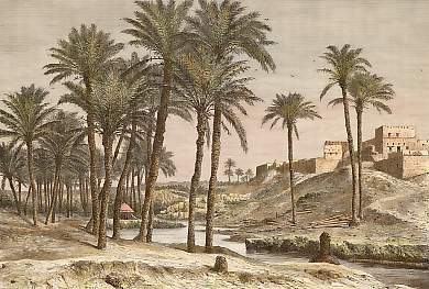 Egypt. Original wood engraving drawn by A. de Bar, engraved by C. Bertrand. 1885. Light foxing in the margins. Hand-coloured. 19x13cm. Matted.