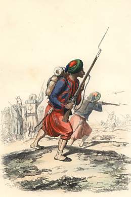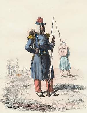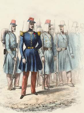 Algeria. Original wood engraving drawn by Raffet, engraved by Hebert. 1843. Soiled in lower margin. Original hand-colouring. 14x12cm. Matted. Uniforms of the French Army During the Colonisation War in Algeria, 1830-1847.