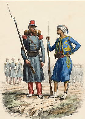 Militaria. Uniforms of the French Army During the Colonisation War in Algeria, 1830-1847. Original wood engraving drawn by Raffet, engraved by Hebert. 1843. Good condition. Original hand-colouring. 16x12cm. Matted.