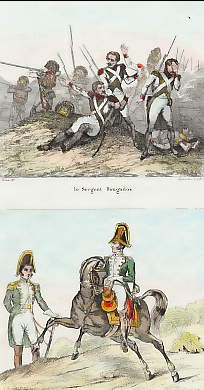 France & Spain. Original steel engraving. Le Sergent Dougados: engraved by Lacauchie after Lehner. Troupes Espagnoles, Carabiniers: engraved by Réville after Roland. 1835. Very good condition. Hand-coloured. 20x10,5cm. Matted.