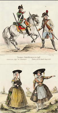 Austria & Netherlands. Original steel engraving. Troupes Autrichiennes En 1793: engraved by Masson after Martinet. Femmes De La Gueldre et De La Frise : drawn and engraved by A. Lacauchie. 1835. Very good condition. Hand-coloured. 20,5x10,5cm. Matted.