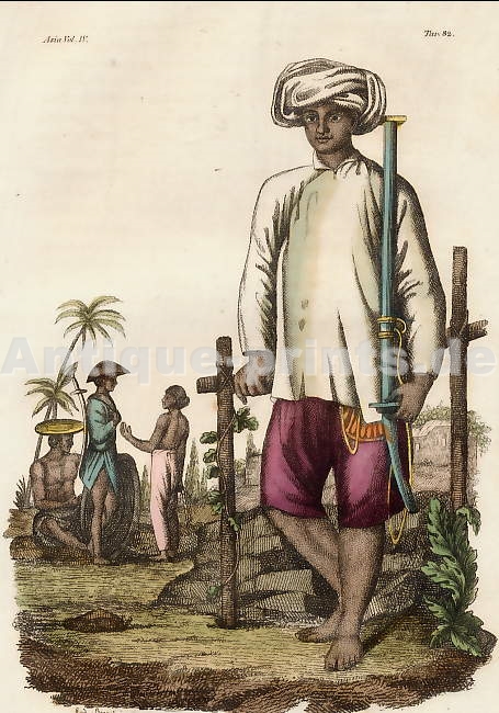 India. Original aquatint, drawn and engraved by A. Bernieri. 1824. Good condition. Original hand-colouring. 15,5x11cm. Matted.