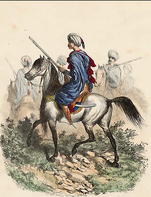 Algeria. Original wood engraving, engraved by Hebert after Raffet. 1843. Foxing. Original hand-colouring. 15x13cm. Matted.