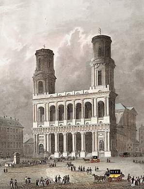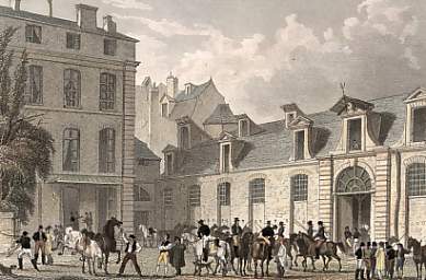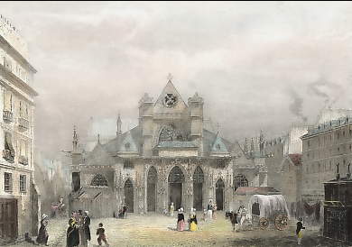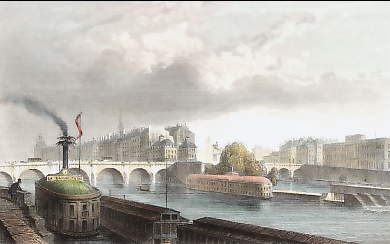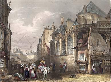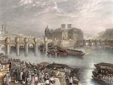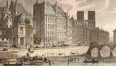 Paris. Steel engraving ""from original drawings taken under the direction of A. Pugin, the engraving executed under the superintendence of C. Heath"". 1831. Good condition. No title under the plate. Hand-coloured. 13,5x8cm. Matted.