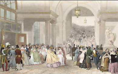 Paris. Original steel engraving, engraved by F. Heath after Eugène Lami. 1845. Very good condition. Hand-coloured. 16x10cm. Matted.