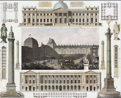 Paris. Original steel engraving, engraved by Ackermann and Feldweg after G. Heck. 1849. No title on the plate. Very good condition. Hand-coloured. 25x20cm. Matted. 1. The Palace of the tuileries in Paris, 2-3. The Navy Departement in Paris, 4. The Luxembourg Palace in Paris, 5. The Palace of Lacken, 6. Plan of the Glyptothek in Munich, 7-9. The Column of the Place Vendome in Paris, 10ab-11. The Column of July in Paris, 12-13. The Bell Tower in Rome .