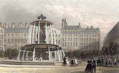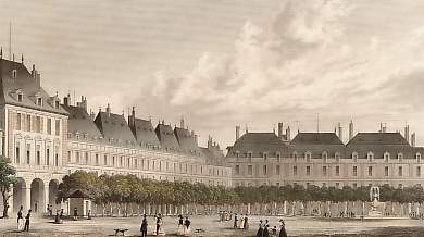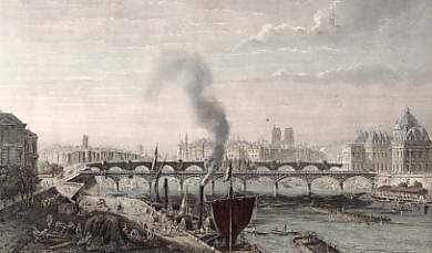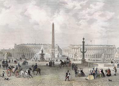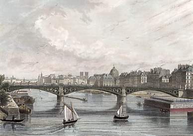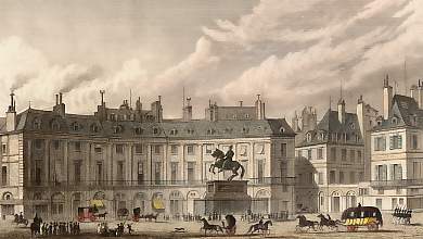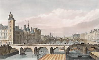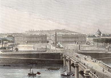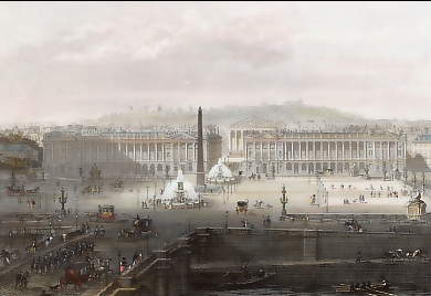 Paris. Steel engraving "from original drawings taken under the direction of A. Pugin, the engraving executed under the superintendence of C. Heath". 1831. Good condition. No title on the plate, on chine appliqué. Hand-coloured. 13x9cm. Matted.