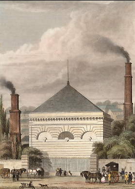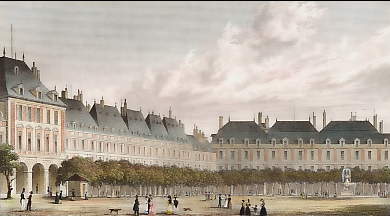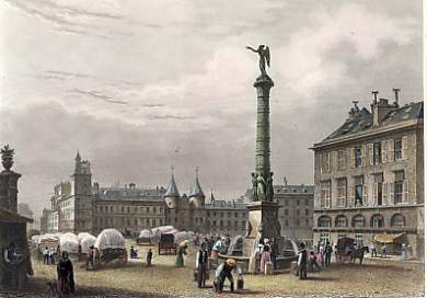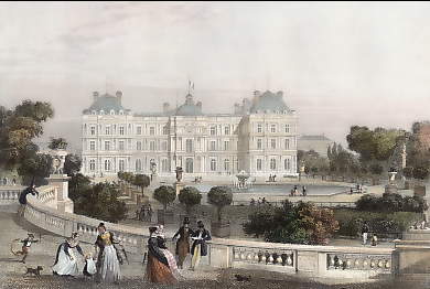 Paris. Steel engraving "from original drawings taken under the direction of A. Pugin, the engraving executed under the superintendence of C. Heath". 1831. Light foxing in the margins. No title under the plate. On chine aplliqué. Hand-coloured. 12,5x9cm. Matted.