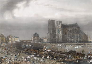 Paris. Steel engraving "from original drawings taken under the direction of A. Pugin, the engraving executed under the superintendence of C. Heath". 1831. Good condition. No title on the plate, on chine appliqué. Hand-coloured. 14x8cm. Matted.