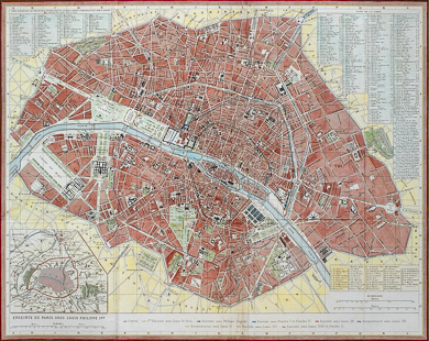 Paris. Original city plan on steel drawn and engraved by S. Jacobs, letters engraved by A. Blanchard. Insert: Enceinte de Paris sous Louis-Philippe Ier. 1846. Small repaired tear. Hand-coloured. 43x34cm.