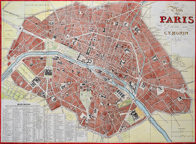 Paris. Original map on steel by C. V. Monin. 1834. Small repaired tear in the margin. Hand-coloured. 43,5x32cm.