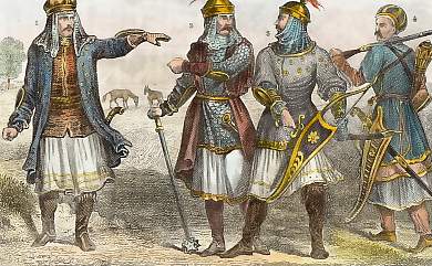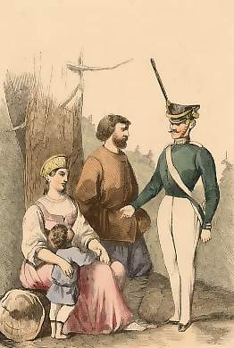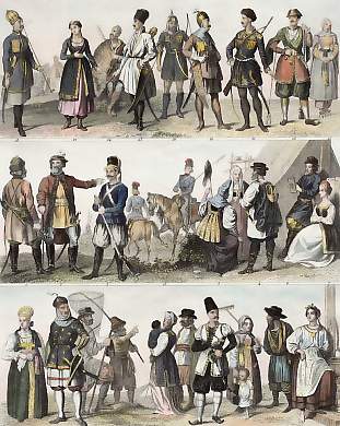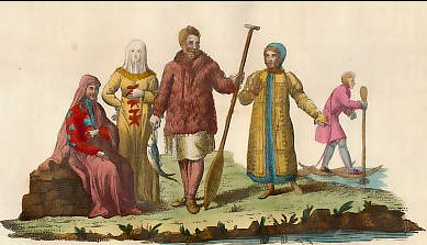 1-2. Strielzi (Shooters), 3. Russo-Polish guard, 4-7. Inhabitants of Little Russia, 8-10. Fishermen from the Volga, 11. Inhabitants of Novgorod, 12&13. Inhabitants of the district of Twer, 14. Inhabitants of the Ukraine, 15. Cossack of the Don, 16. Inhabitants of the district of Moscow, 17-22. Circassians, 23. Turkoman, 24. Abasian 25. Mingrelian, 26. Imeritian, 27. Georgian