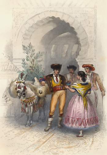 Spain. Original wood engraving, drawn by E. Breton. 1846. Very good condition. Hand-coloured. 16x10cm. Matted.