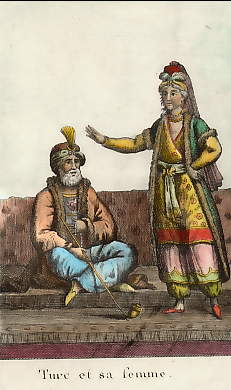 Turkey. Original wood engraving, engraved by Meunier after Lancelot. 1876. Very good condition. Hand-coloured. 19x13cm. Matted.