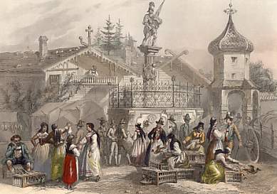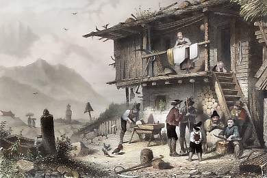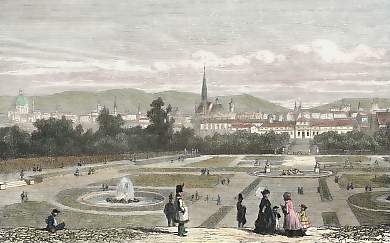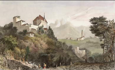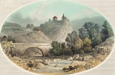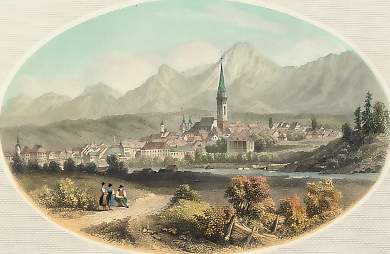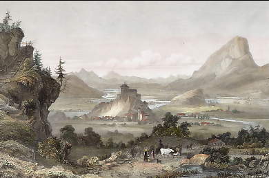 Austria. Original wood engraving drawn by K. Girardet, engraved by Pannemaker. 1863. Foxing in the right margin. Hand-coloured. 15,5x9,5cm. Matted.